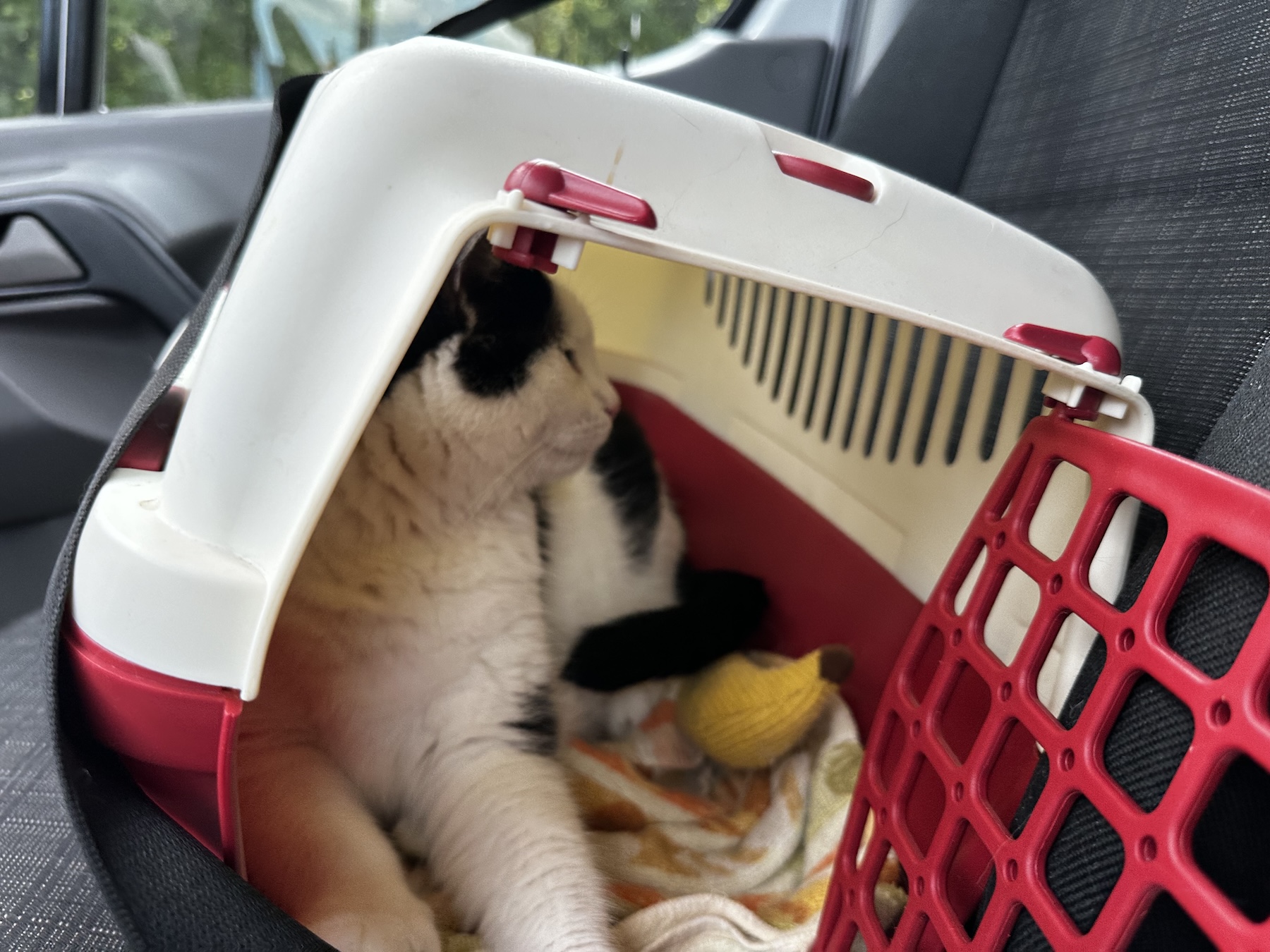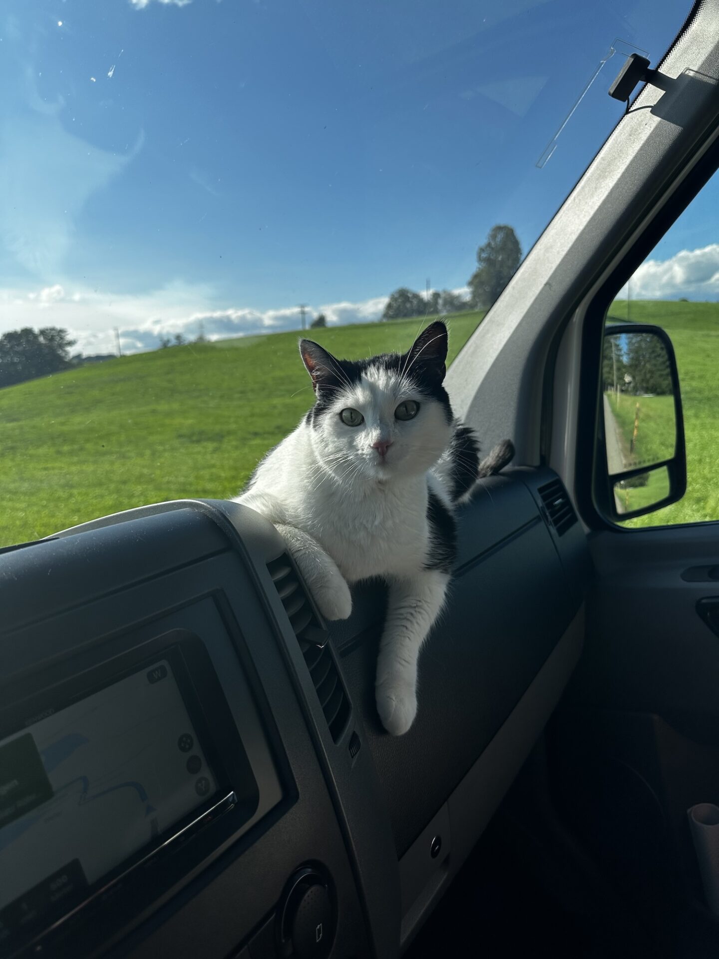 Anstatt ihn direkt in seine Box zu packen lasse ich ihm jetzt die freie Wahl, wo er sich aufhalten möchte. d.h. er kann sich während der Fahrt frei bewegen. Seine permanenten Schreie sind damit passé – und sogar im Gegenteil: Er genießt die Fahrt zunehmend, zB indem er auf dem Tisch sitzt und nach vorne raus schaut.