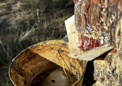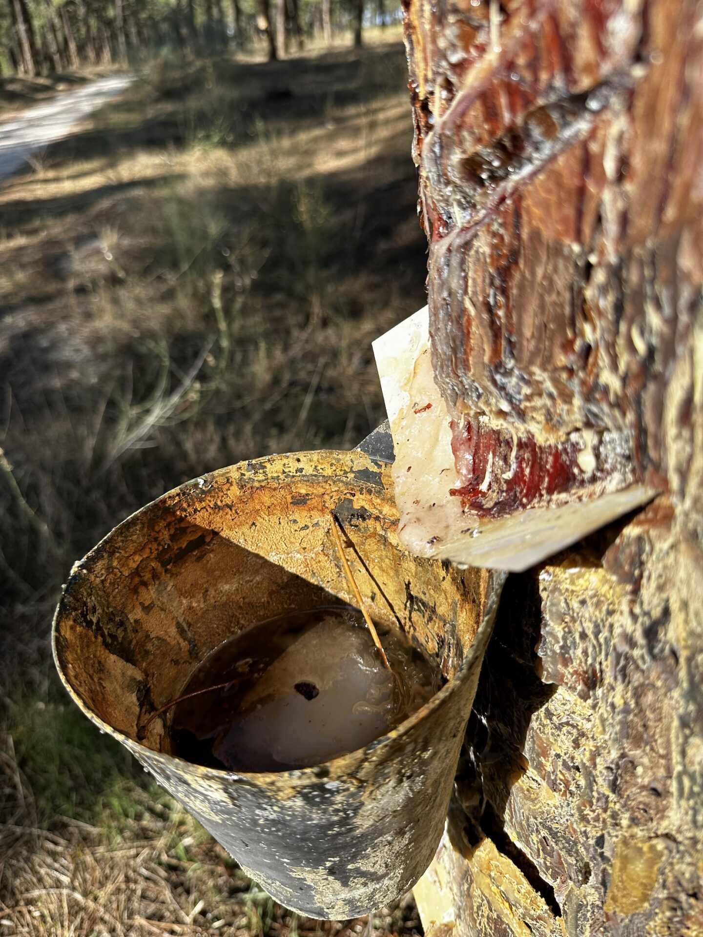 - Das Harz von den Pinien wird hier geerntet. Die blutenden Bäume zu sehen ist ein sehr gewöhnungsbedürftiger Anblick für mich
